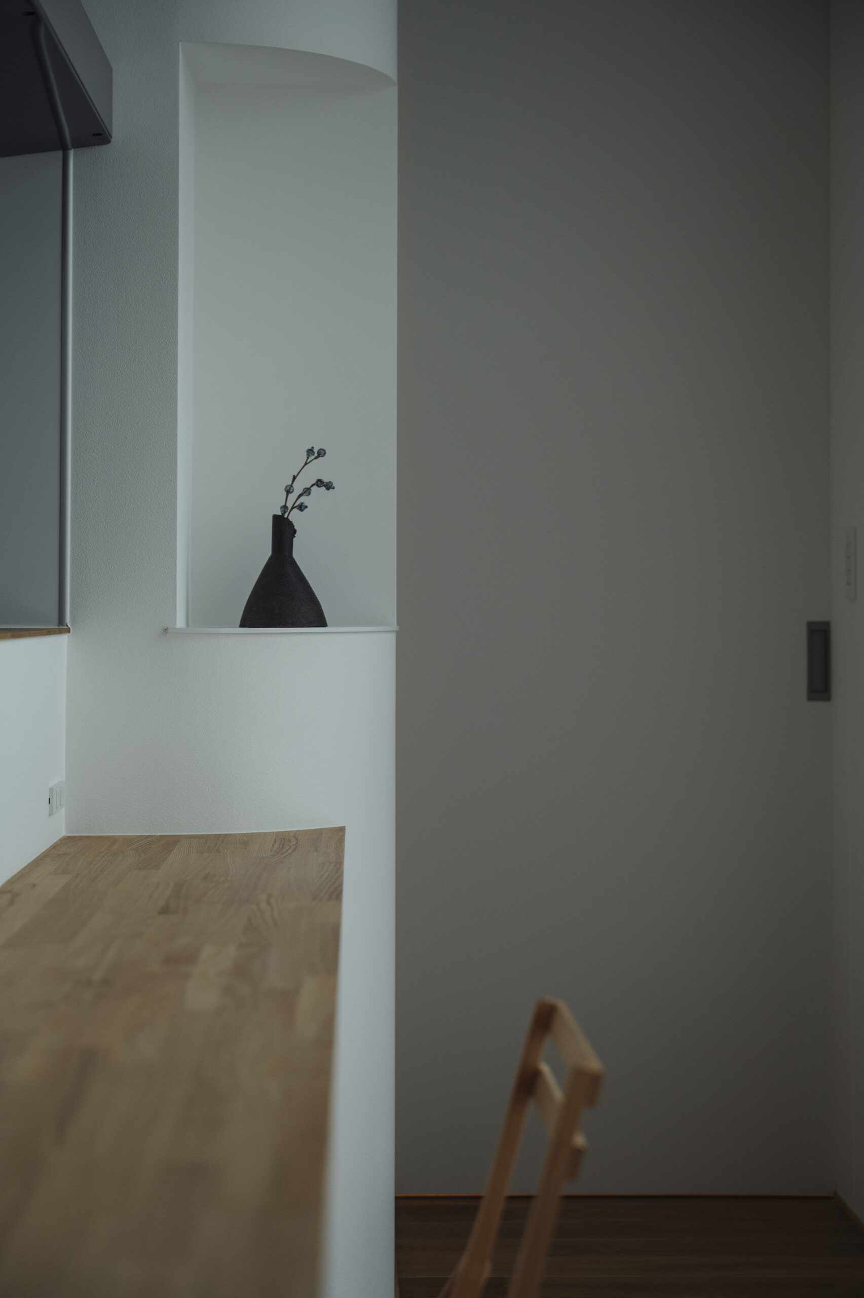 小窓のついたR壁の空間は2階のホールとなっており、お子さんの勉強スペースとして活躍します。