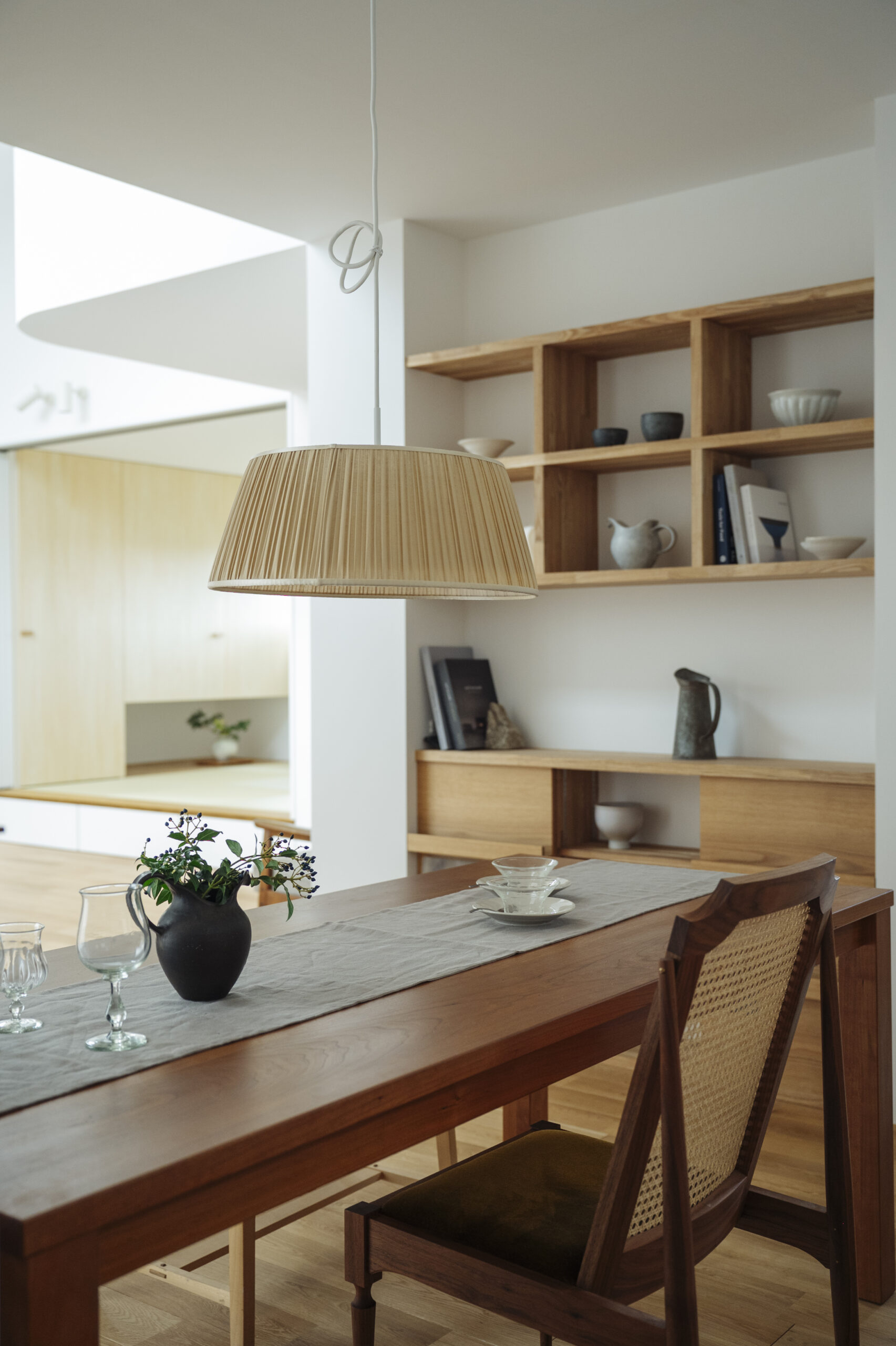ダイニング横の飾り棚や畳下の引き出しなど、手の届く位置に小さな収納を作ることでモノが溢れないすっきりとした暮らしが実現しそうです。