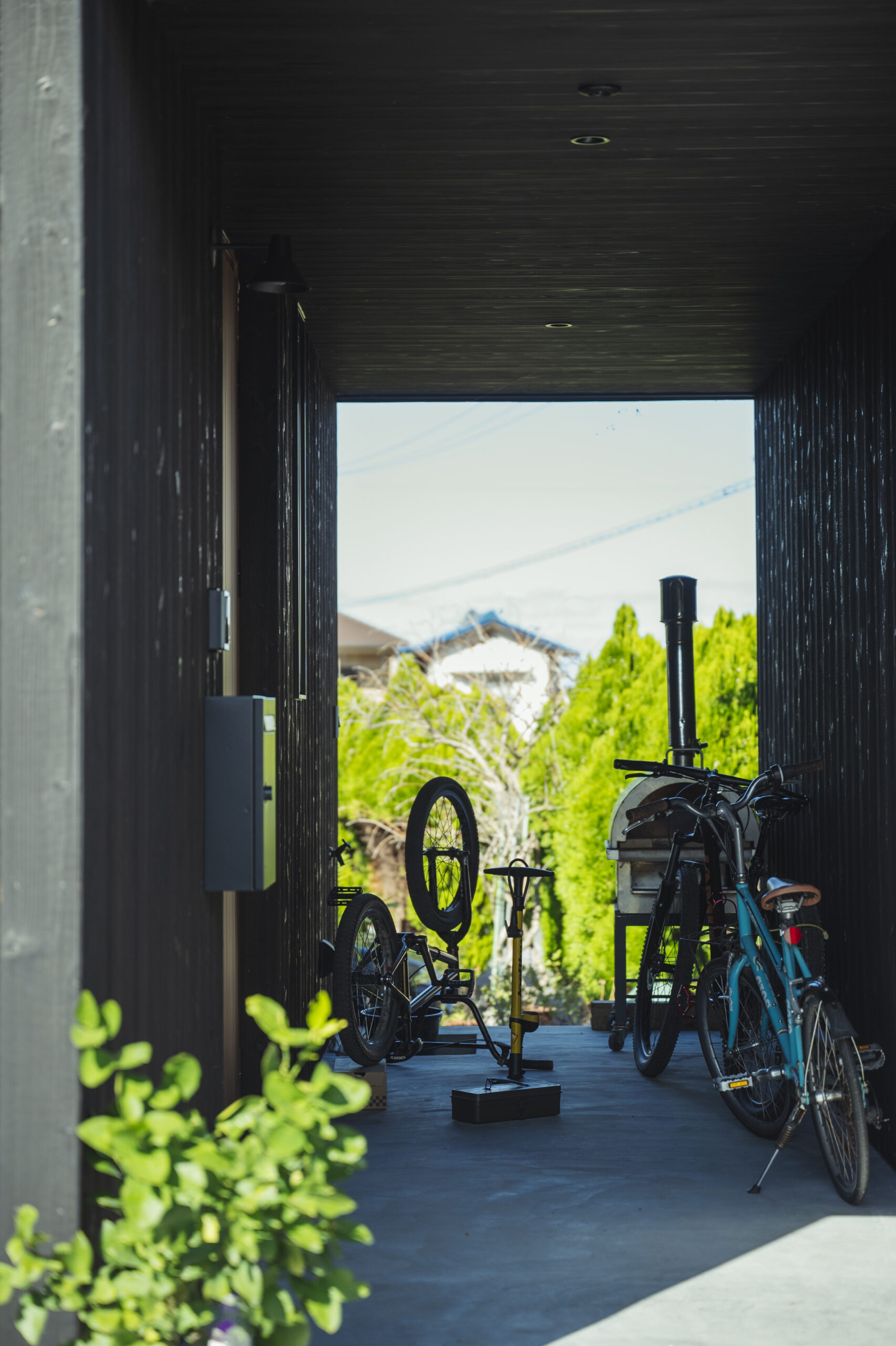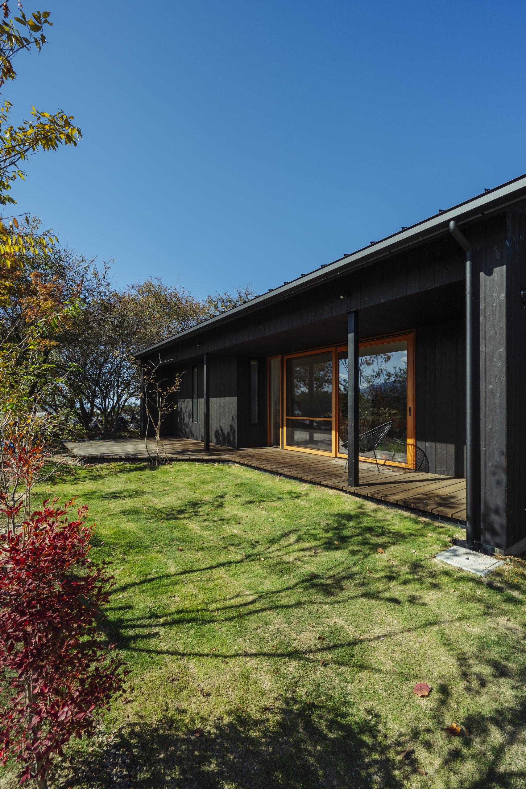 シックな黒色が緑豊かな景色に映える焼杉の家。
