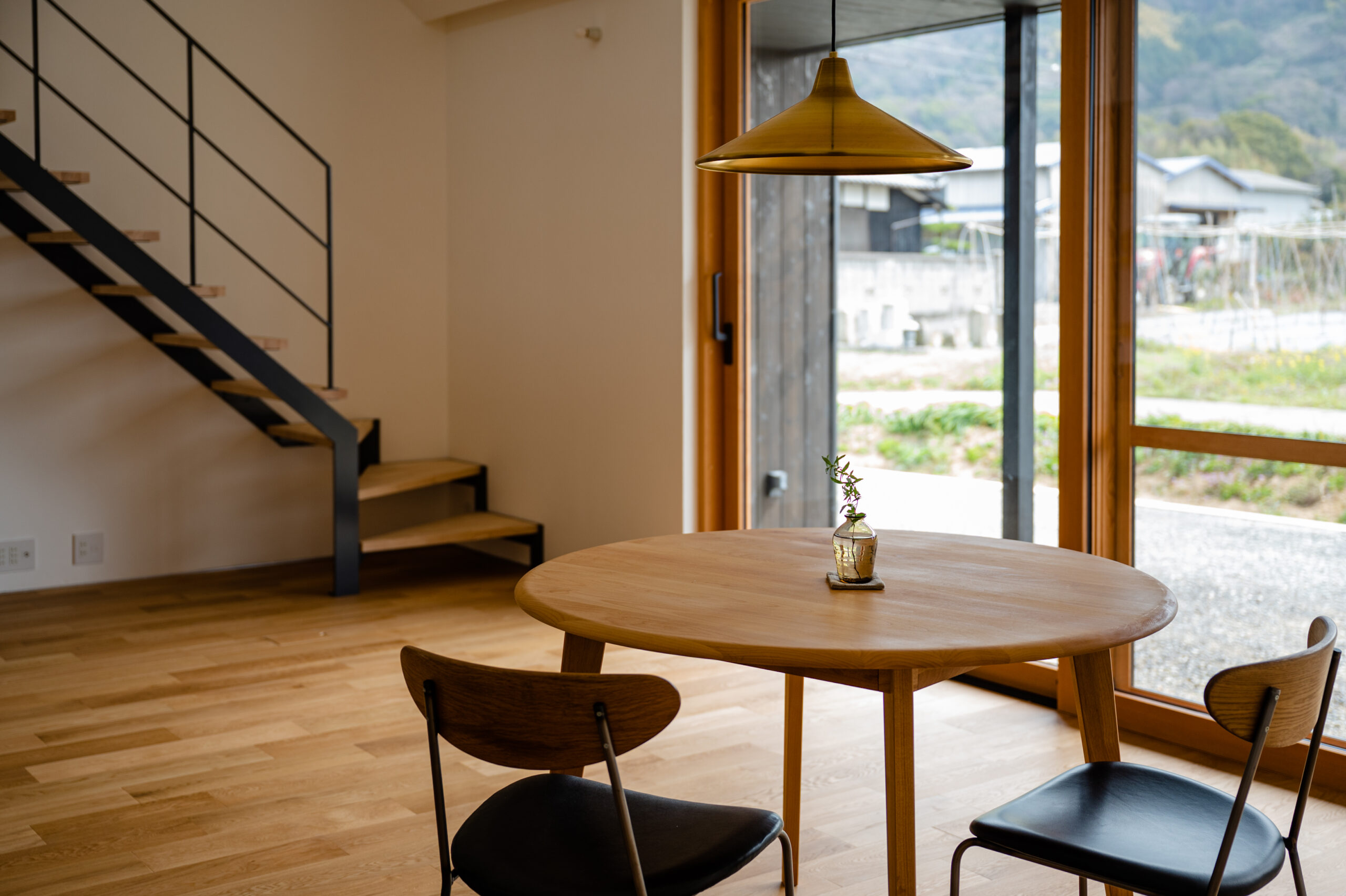 庭に面する開口部には幅3.4mにも及ぶ大開口の木製のサッシが外の豊かな自然を内へとシームレスに繋ぎます。